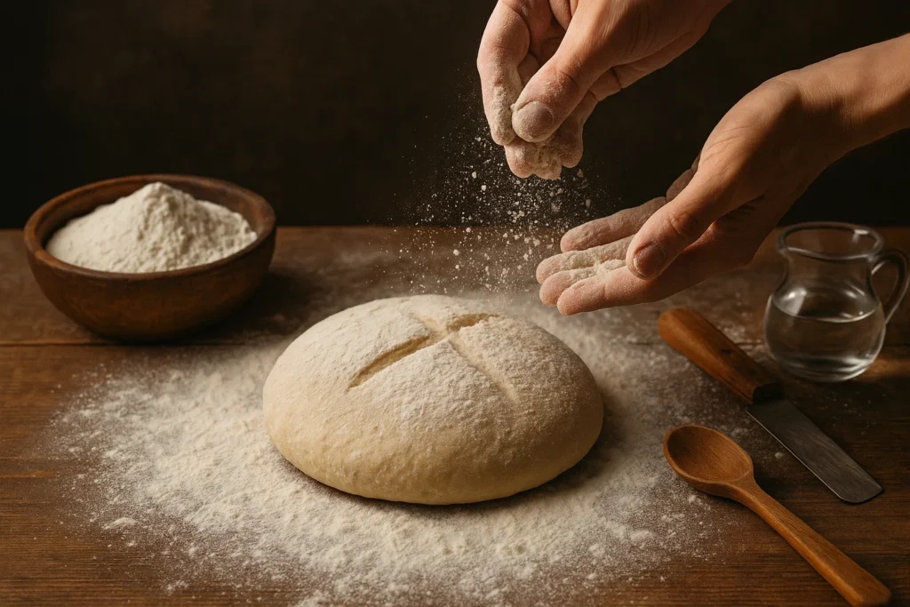 Тут треба терпіння. Хвилин 15 точно. Тісто спочатку липке, неслухняне — а потім раптом стає пружним, м’яким, майже живим під руками. Відчуваєте цей момент? Коли воно перестає липнути і починає ніби дихати?