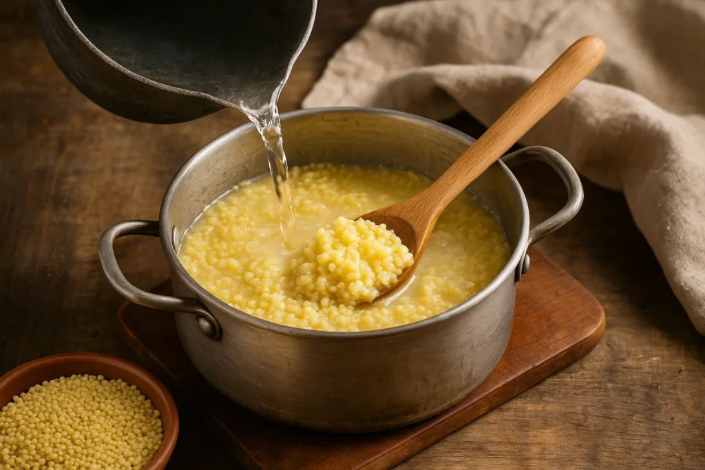 Крок 1. Промите пшоно засипаємо у каструлю з товстим дном (це важливо для рівномірного прогрівання), заливаємо водою. Пропорція? Класична — на 1 склянку крупи 2-2,5 склянки води. Хочете розсипчасту — 2 склянки. Хочете помазкувату — 2,5.